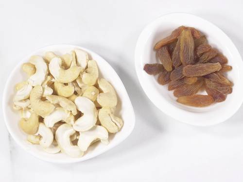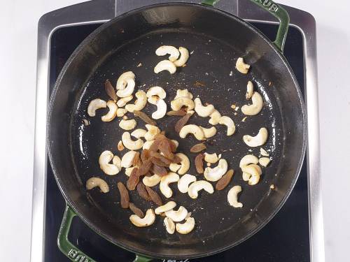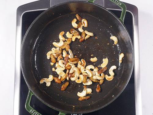 1. I prefer to use 20 to 25 whole cashews (split open later) and 2 to 3 tablespoons sweet raisins for garnish. You may skip them if you want.