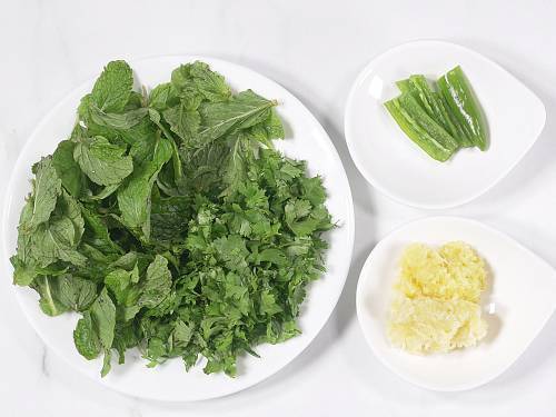 - Rinse & drain mint leaves and coriander leaves. Chop and set aside.