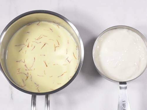 2. Heat ¼ cup milk in cup or sauce pan and add 2 to 3 large pinches of saffron strands. Optionally, also add ½ tbsp. of kewra or rose water to it and keep aside. Whisk 1¼ cup fresh yogurt (not sour) well with a whisk or fork and set aside. (To use Greek yogurt whisk 1 cup Greek yogurt with ¼ cup milk.)