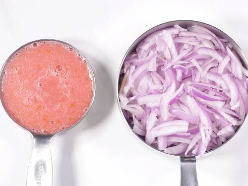 3. Puree ½ cup tomatoes (sweet tomatoes) in a small grinder. Slice 2 cup onions thin and evenly so they fry evenly. I use 1 large onion, slice and then halve the slices so they fry faster. You will slice and then squeeze them gently to separate the layers completely, then measure.