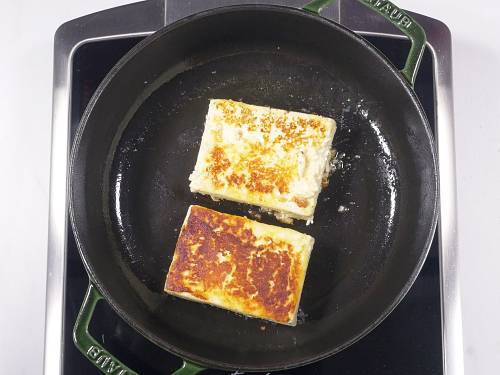 - Heat a tablespoon ghee in a heavy bottom pan. When it is hot enough, place the paneer block/s gently and fry it on a medium high heat until golden on both the sides.