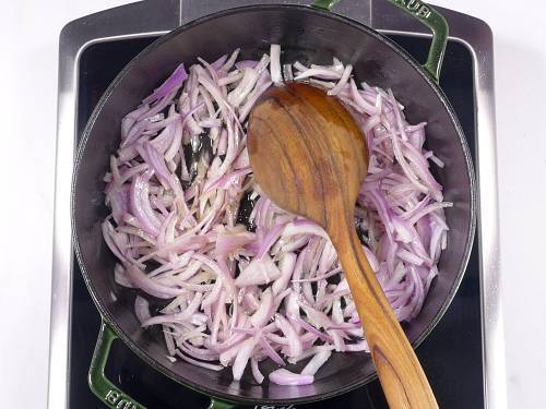 11. Pour 4 tablespoons ghee and add the sliced onions. Begin to fry on a medium high heat. Keep stirring often & spread them in the pan. Continue to fry for a few minutes, then reduce the flame as needed to medium or low.