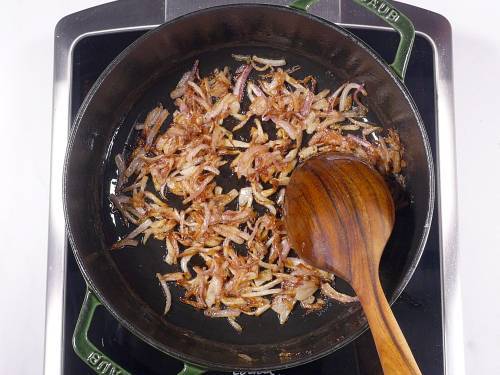 - Remove 2 tbsps of these fried onions to a plate and set aside.