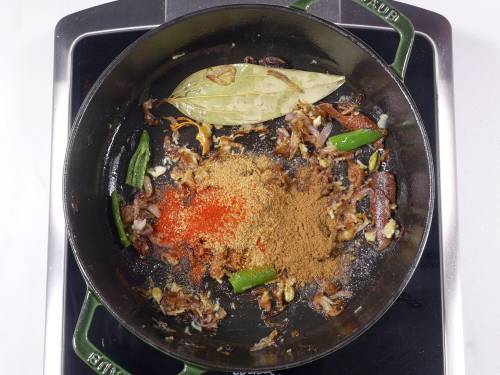 - Add salt & spices – biryani/ garam masala, Coriander powder, Cumin powder, Kashmiri red chilli powder & turmeric.