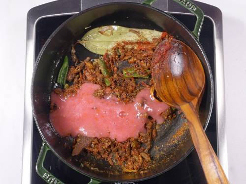 - Pour the tomato puree and cook until it turns thick & aromatic.