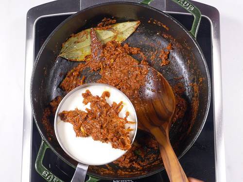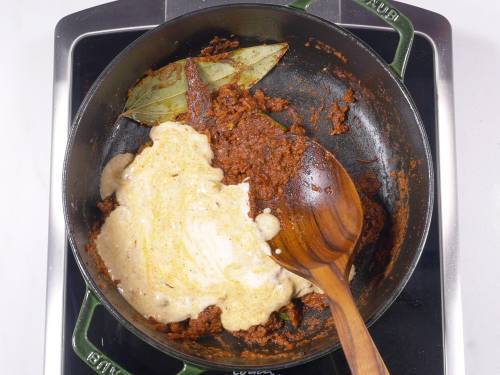 19. Turn the heat to low and add the spiced yogurt to the pot.