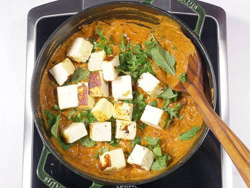 - Taste test and adjust salt or garam masala if you want. Add ¾ of the prepared mint leaves, ¾ of the coriander leaves and ¾ of the fried paneer (save some for kids or to garnish). Cover and keep aside until the rice is ready.