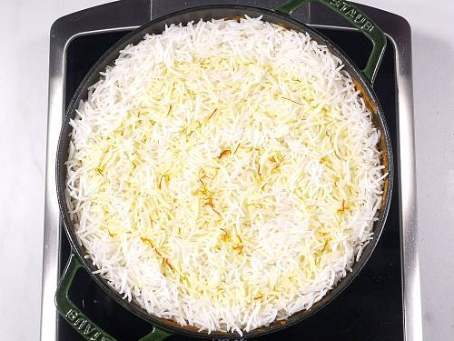 - Layer the rice over the gravy & pour saffron milk all over evenly.