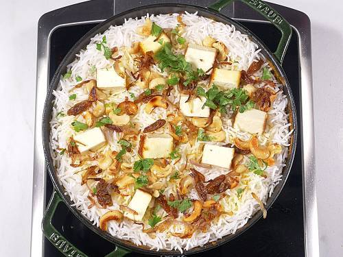 30. Serve Paneer Biryani in layers such that every serving gets a part of the bottom layer paneer masala, the middle layer basmati rice and top the layer garnishes.