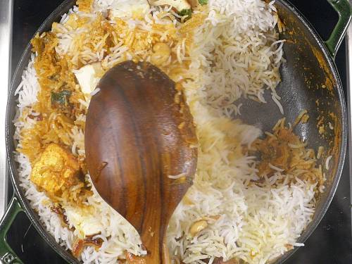 - Make sure the paneer gravy and the rice both are hot and not warm or cold before you layer the biryani. If the gravy is cold, heat it until hot and turn off. Also make sure the gravy is slightly runny else it will burn.