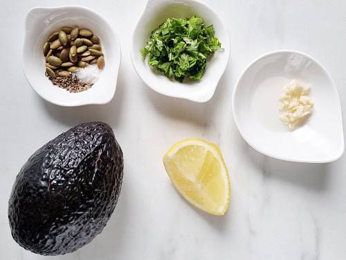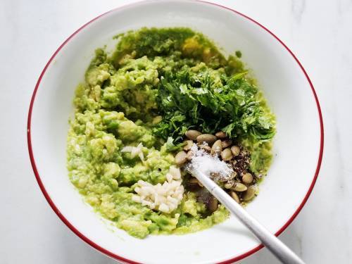 - Add avocado flesh to a bowl and mash with a fork. Add salt, oil, lemon juice, black pepper, pumpkin or sunflower seeds and chopped cilantro. Mix together and adjust salt and lemon to taste.