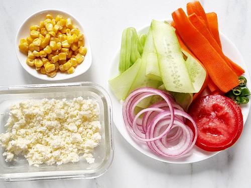 1. Wash carrots, onions, avocado, tomatoes, coriander leaves & green chilies. Grate the carrots, finely chop onions & garlic. Deseed and chop tomatoes. Finely chop coriander leaves. Boil corn if using from cob. I used frozen corn so I just rinsed them , drained and used here. Cut avocado to 2 and remove the seed. Scoop the pulp & cut to small cubes.