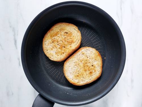 - Butter your bread slices on both sides and toast them on a pan on a medium heat. While the bread toasts, prepare the rest of the ingredients.
