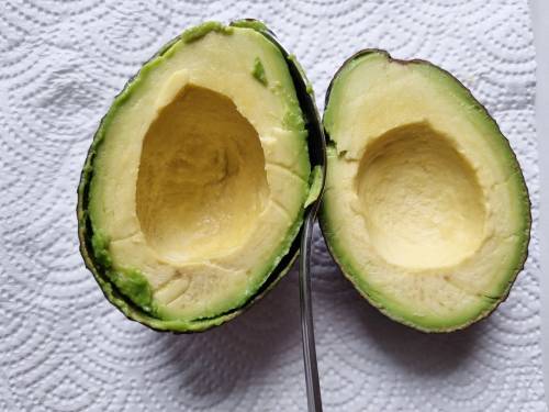 4. Cut the avocado and discard the stone. Scoop out the flesh with a spoon.