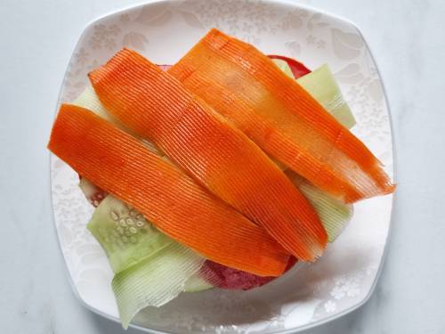 8. Place the tomato slices, cucumbers and carrots.
