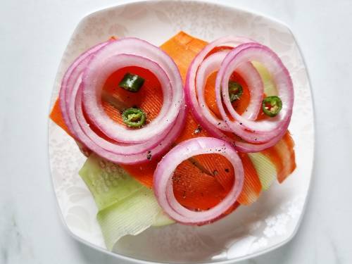 9. Place the pickled onions and jalapenos. Sprinkle little salt and pepper. If you want to use arugula or any micro greens, place them.
