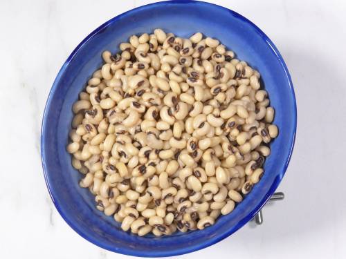 Cook beans in Pot: Soak the dried black eyed peas overnight with 4 cups water and half teaspoon baking soda. Rinse them well later and bring 3 cups water to a rolling boil and add the beans. Reduce the heat to medium and cook until tender for about 1 hour or more. They should be soft yet hold shape.