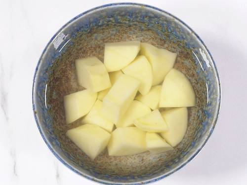 5. Peel and dice potato to 1.5 inch cubes and keep them immersed in water until used. You may skip the potatoes in the recipe and save 10 minutes cook time.