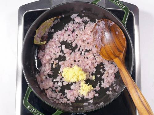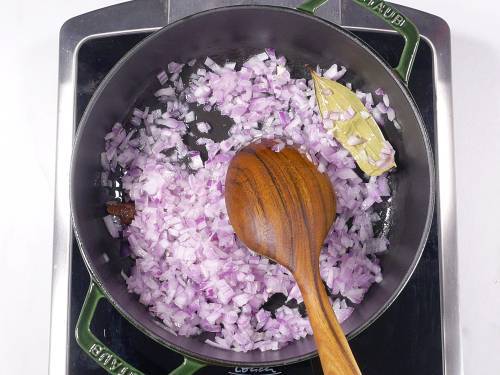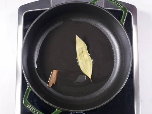 - Pour oil to a pan and heat it. Add bay leaf and cinnamon if using.