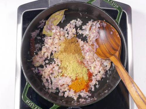 9. Lower the heat. Stir in all the ground spices and salt.