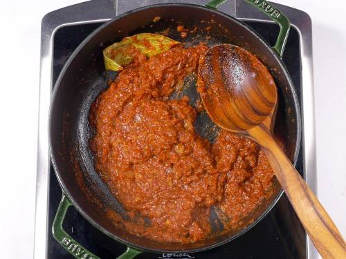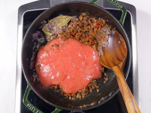 10. Pour the tomatoes puree or chopped tomatoes. (If using canned tomatoes or passata, add it later after cooking the potatoes.)