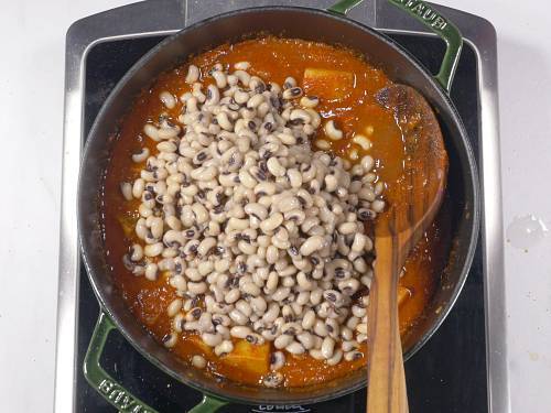 - Transfer the black eyed peas (precooked or canned) along with the stock (beans cooked water). (If using canned beans, drain the liquid off and rinse them well under running water before adding to the curry).