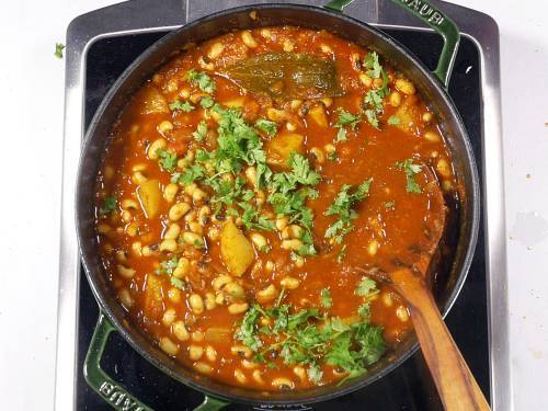 - Turn off and garnish black eyed peas curry with chopped coriander leaves. Serve it over steamed rice, quinoa, steel cut oats or millets. It also goes well with naan, roti, chapati or artisan breads.