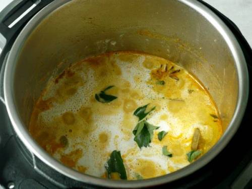 - Heat oil a pan or instant pot (on sauté mode) and add the whole spices. When they begin to sizzle, add curry leaves and onions.