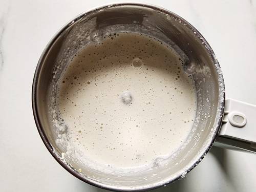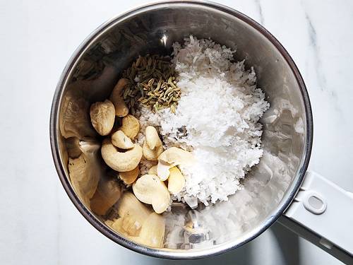 3. If you don’t have raw coconut, you may use coconut milk. To a small grinder jar, add â…“ cup grated raw coconut, 10 cashew nuts (or 1 tbsp fried gram), 1 teaspoon fennel seeds and pour ½ cup water.
