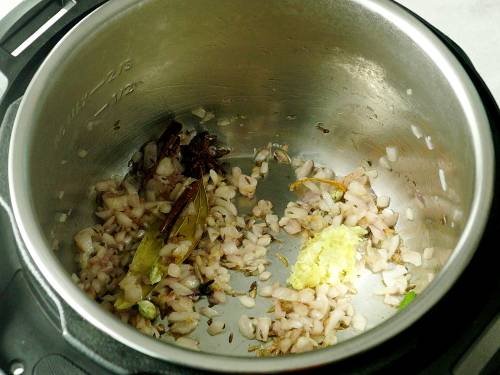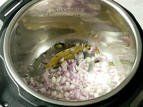 5. Heat 3 tablespoons oil in a pan or instant pot (on sauté mode) and add the whole spices. When they begin to sizzle, add curry leaves and onions.