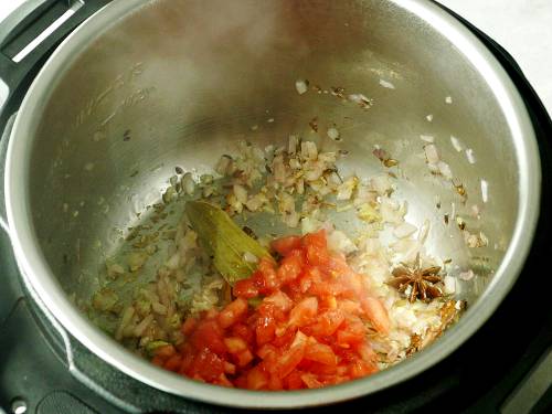 7. Saute for 1 minute and add tomatoes. Cook until the tomatoes break down to a mush.