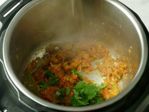 - Stir in the salt, turmeric, chili powder and garam masala. Add mint leaves and saute until aromatic for 1 to 2 mins.