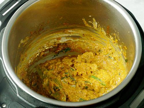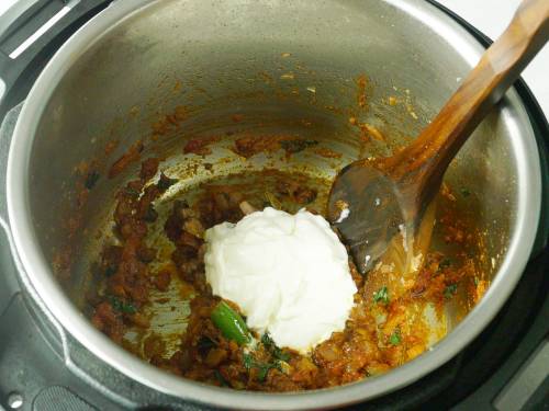 10. Turn down the heat and add â…“ cup whisked yogurt. Use thick yogurt only.