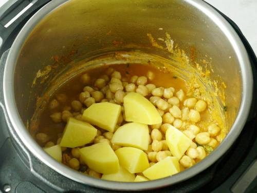- You don’t need to boil the potatoes if cooking aloo chana in Instant pot. Else boil them in 1 cup water, until 95% done – al dente, almost cooked but not mushy or water logged. If you want you may use half tsp garam masala while boiling them.Â