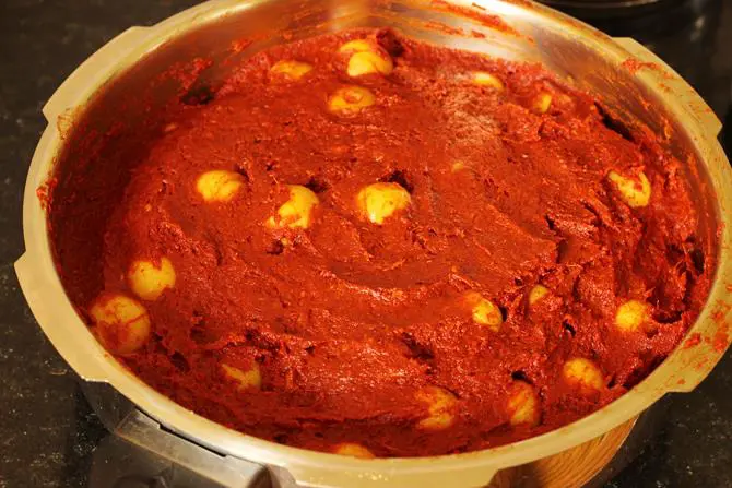 22. Take a dry ladle and mix well. You can also use your dry and moisture free hand. But using your hand at this point may give you chilli and garlic burns.