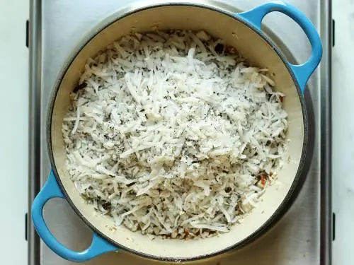 7. Add dried coconut or copra. Fry until the coconut turns slightly aromatic.