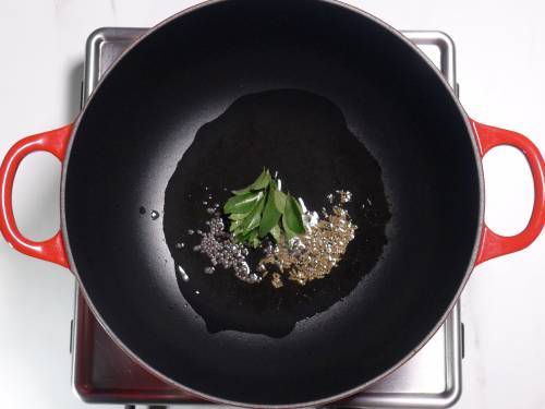 1. Heat a pan with 2 tablespoons oil. Add ½ teaspoon mustard seeds and ½ teaspoon cumin seeds. When they begin to splutter, add curry leaves (rinsed & pat dry) & a pinch of hing.