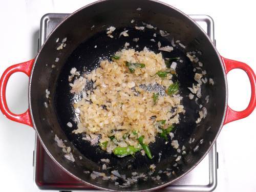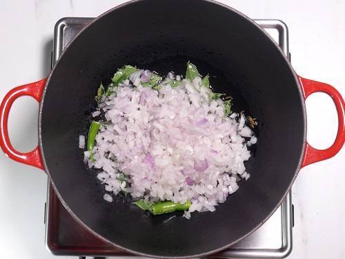 - When they begin to sizzle, add hing, curry leaves, onions and green chilies. Saute until the onions turn completely golden.
