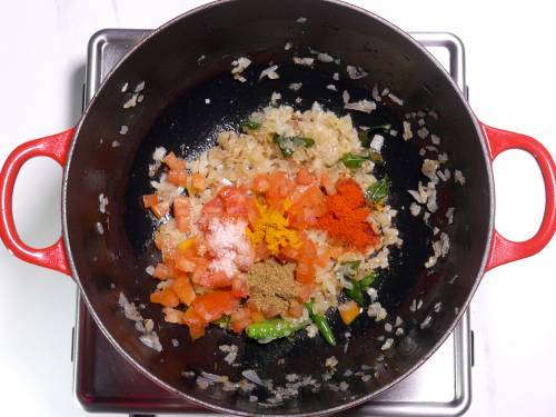 - Add tomatoes, salt and turmeric. Mix and saute until the tomatoes turn mushy.