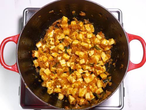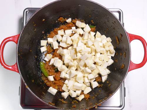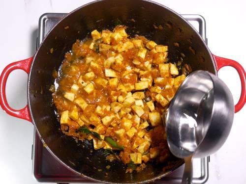 - Cover and cook for 3 to 4 mins on a very low flame until fork tender but not mushy. We prefer a dry curry, so I evaporate all the water by cooking for 2 to 3 mins more. Taste test and adjust salt and spices.