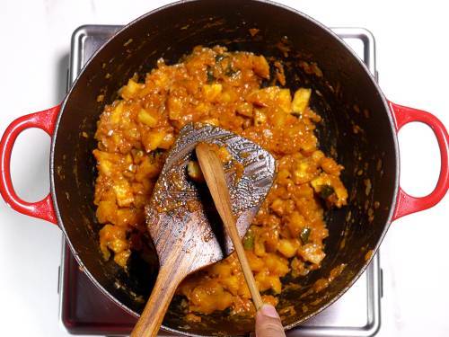 Option 2: If using Non-GMO green bananas or mature bananas that are harder, boil the cubed pieces in water in a separate pot for a few minutes until slightly tender but not mushy. Pour half cup water of this water to the onion tomato masala and cook it until thick like a gravy. Then add the boiled banana pieces to the gravy and simmer for a while until the pieces are cooked through completely.