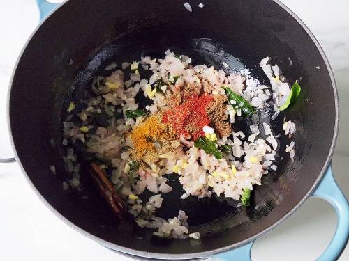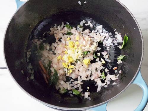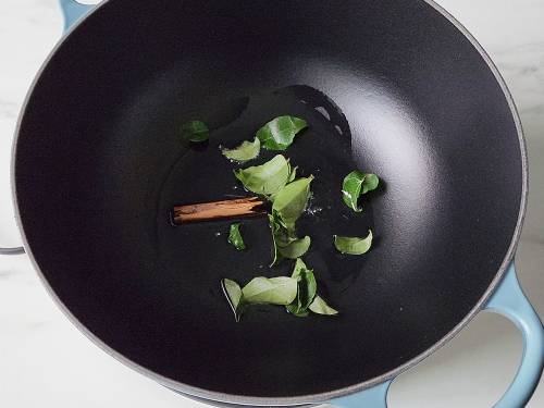 - On a medium flame, heat oil in a deep pot or Dutch oven. Add cinnamon and curry leaves, followed by onions.