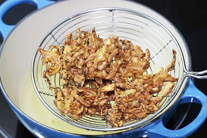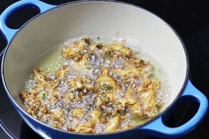 7. Heat oil in a kadai on a medium heat. When the oil turns just hot enough, regulate the flame to medium high, then slide small flat portions of the pakoda dough to the oil.