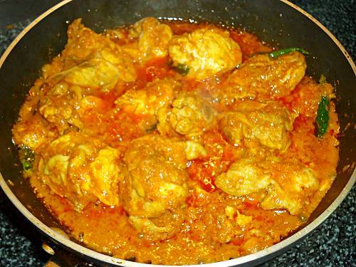 - On a medium flame, cook the chicken till it is soft cooked and tender. Little water can be added while cooking if the chicken turns dry. Once done, turn off the heat. Excess moisture in the pot at this stage is alright.