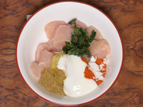 1. Add chicken cubes to a mixing bowl. I cubed them to one by one inch size. Add garlic ginger paste, garam masala, red chilli powder, coriander powder, salt, pepper powder, yogurt and curry leaves. You can substitute curry leaves with any of your favorite herbs like mint.