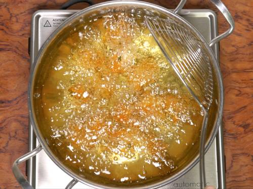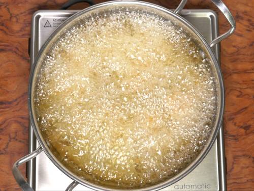 5. Fry on a medium heat. Do not disturb the pieces for 1 to 2 minutes. Keep stirring and fry until golden and crisp. When the chicken is cooked completely you will see that the bubbles in the oil reduce.
