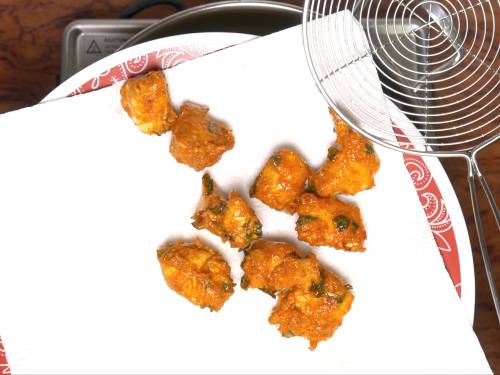 After the resting time, the marinade turns very thick as the corn starch absorbs moisture. If needed you can sprinkle 1 tbsp water and mix it well. Do not add a lot otherwise the chicken will not be crispy.