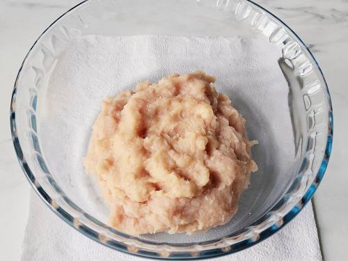 2. You also need 1 lb. (450 grams) ground chicken (or boneless breasts+ thighs, ground slightly coarse like seen in the picture below). If you want to use fresh onion, chop 1 medium onion & stir in a pinch of salt. Let rest for 10 mins while you prepare the rest. Later squeeze out as much moisture as possible or add them to a cloth and squeeze out as much liquid as possible. They are ready to use, measure only 4 tablespoons for this recipe.