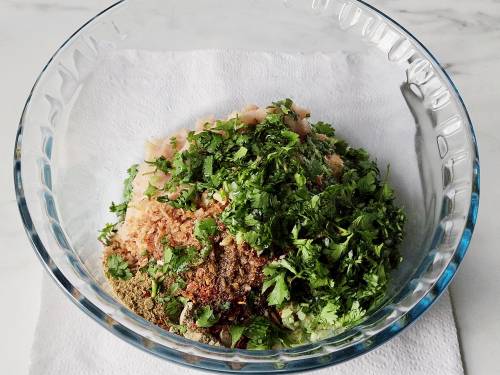 - To use fresh onion: Chop onion & stir in a pinch of salt. Let rest for 10 mins while you prepare the rest. Later squeeze out as much moisture as possible or add them to a cloth and squeeze out as much liquid as possible. They are ready to use.