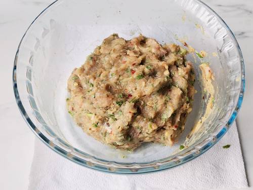 3. Add all the ingredients to a bowl. Wear disposable gloves. Mix & knead together well, for 2 to 3 mins. This is a very important step to mix and knead well.
